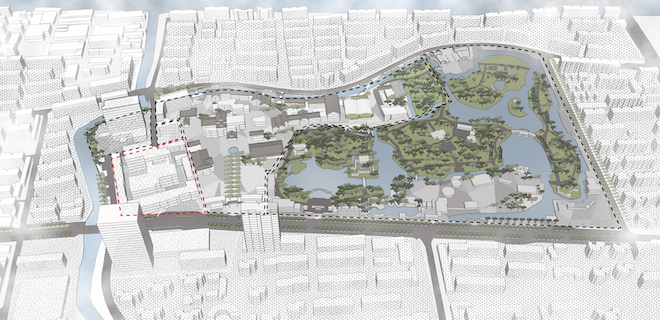 項(xiàng)目創(chuàng)新提出以“公園式商業(yè)漫步街區(qū)”作為目標(biāo)構(gòu)想,將綜合高品質(zhì)街區(qū)商業(yè)、高端宴會(huì)酒店、獨(dú)幢濱水商業(yè)等,立足城市精神內(nèi)核與生長(zhǎng),依傍古華公園,以糅合傳承的建設(shè)理念、去邊界化的運(yùn)營(yíng)理念打造獨(dú)一無(wú)二的奉賢城市生活圖景。
