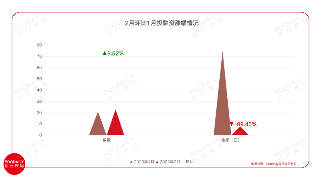 環(huán)比2023年1月,2月的數(shù)量只增加了1起,金額卻下滑了近90%。1月中正味集團、百果園上市,以及中糧福臨門、紛美包裝的股權融資,4個項目就拿下60多億;而2月只有一致魔芋上市。