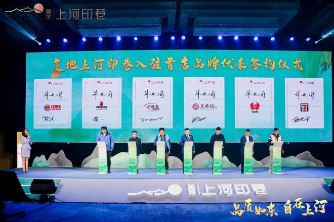 現(xiàn)場(chǎng),復(fù)地上河印巷與入駐首店品牌代表現(xiàn)場(chǎng)簽約,期待一同給顧客提供全新的全景復(fù)合活力街區(qū)。