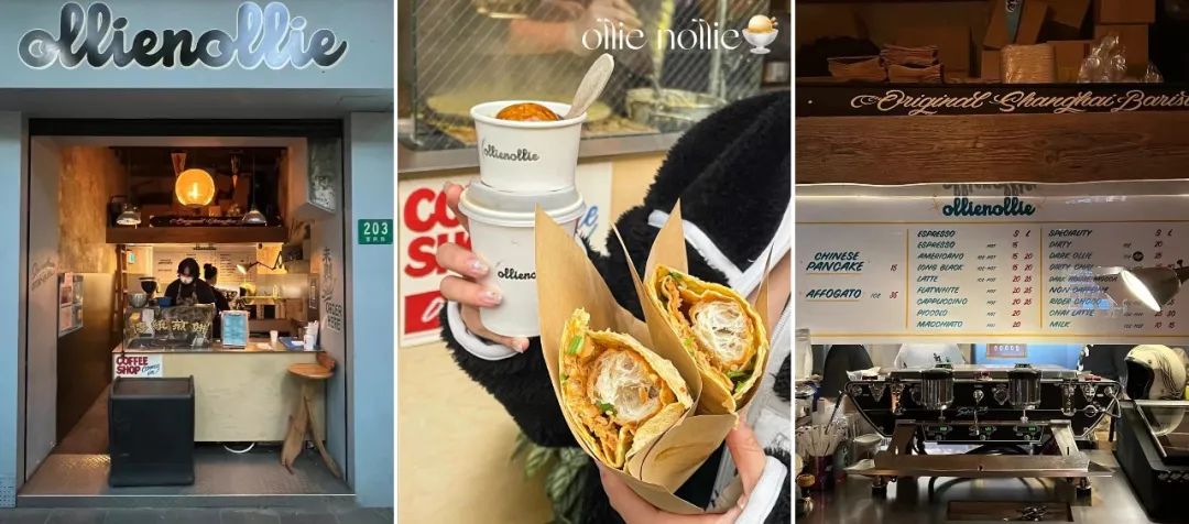 再比如上海富民路上有一間“煎餅+咖啡”的網(wǎng)紅小店 ollie nollie,也曾經(jīng)因?yàn)樯衿娴慕M合售賣形式出圈。煎餅果子15元一套,加入兩個(gè)雞蛋和肉松。配上文藝范兒的裝修環(huán)境,別有一番特色。