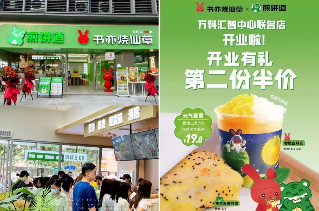 比如煎餅道和書(shū)亦燒仙草聯(lián)名了一個(gè)煎餅?zāi)滩韪拍畹,店?nèi)一半是煎餅操作臺(tái),一半是奶茶操作臺(tái),共享部分空間,也推出相應(yīng)的煎餅茶飲CP組合。