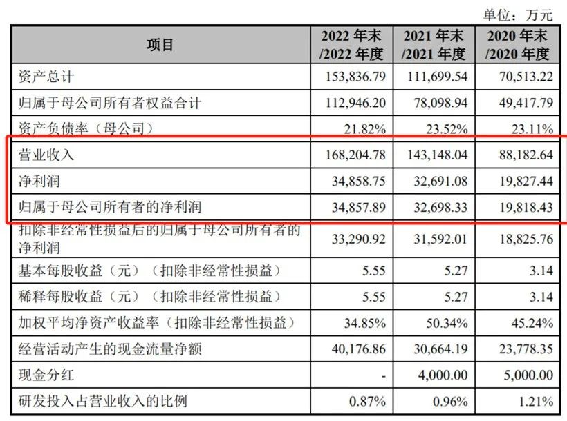 從招股書來看,2020年至2022年毛戈平營收分別為8.82億元、14.3億元、16.82億元,2021年、2022年同比分別增長62.33%、17.5%。凈利潤方面,2020年至2022年凈利潤分別為1.98億元、3.27億元、3.49億元。