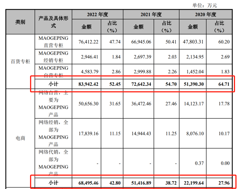 數(shù)據(jù)顯示,2020年-2022年,毛戈平百貨渠道占比維持在50%以上,去年該渠道收入達(dá)8.4億元,其中直營專柜仍然貢獻(xiàn)最多。