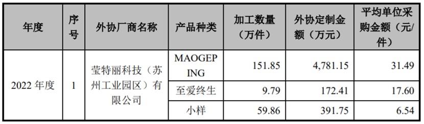 根據(jù)招股書,去年毛戈平對五大外協(xié)廠商的采購金額合計(jì)達(dá)1.5億元,占比40.32%,其中對瑩特麗的采購金額最大為1.04億元。同時(shí),毛戈平品牌的加工件數(shù)為151.85萬件,平均單位采購金額31.49元/件。