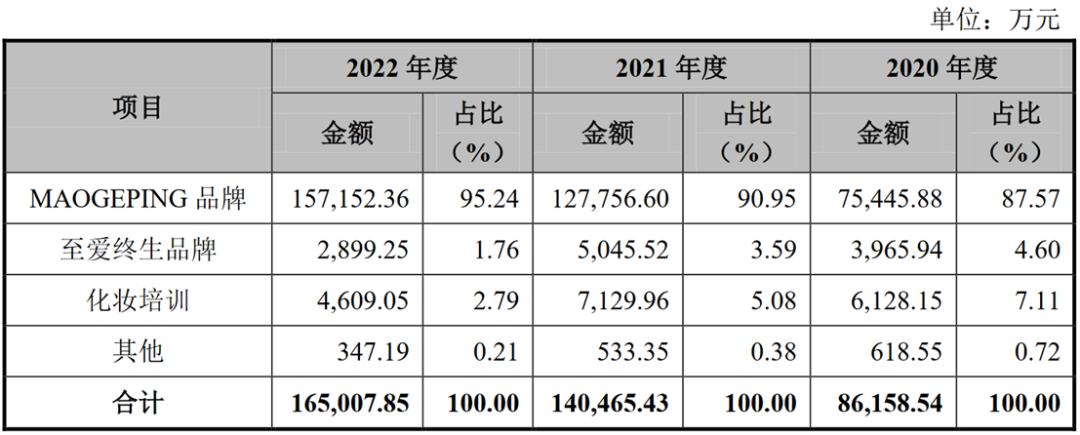 公開資料顯示,MAOGEPING毛戈平品牌(下稱:毛戈平品牌)于2000年創(chuàng)立,因創(chuàng)始人毛戈平得名,定位輕奢、高端;公司另一個(gè)品牌至愛終生創(chuàng)立于2008年,定位于大眾、流行彩妝護(hù)膚品牌。此外,毛戈平公司業(yè)務(wù)還涵蓋化妝技能培訓(xùn)學(xué)校。