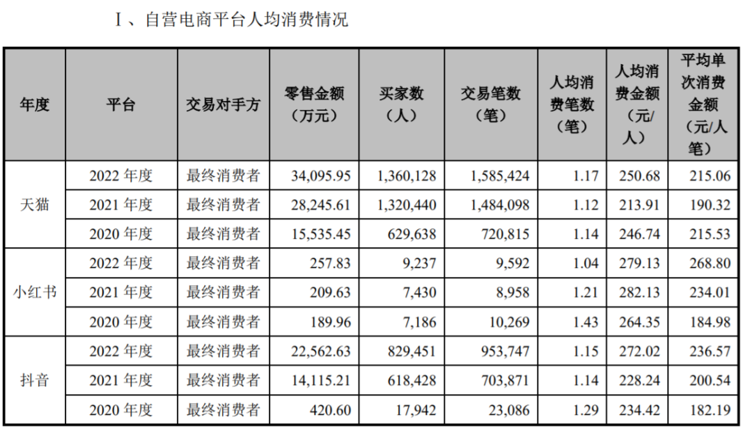 另據(jù)招股書,公司抖音小店于2020年4月設(shè)立并開始對外銷售,2021年迅速起量,2022年繼續(xù)保持增長。其中,2022年在抖音平臺對終端的零售額為2.3億元,平均單次消費(fèi)金額236.57元/人/筆。