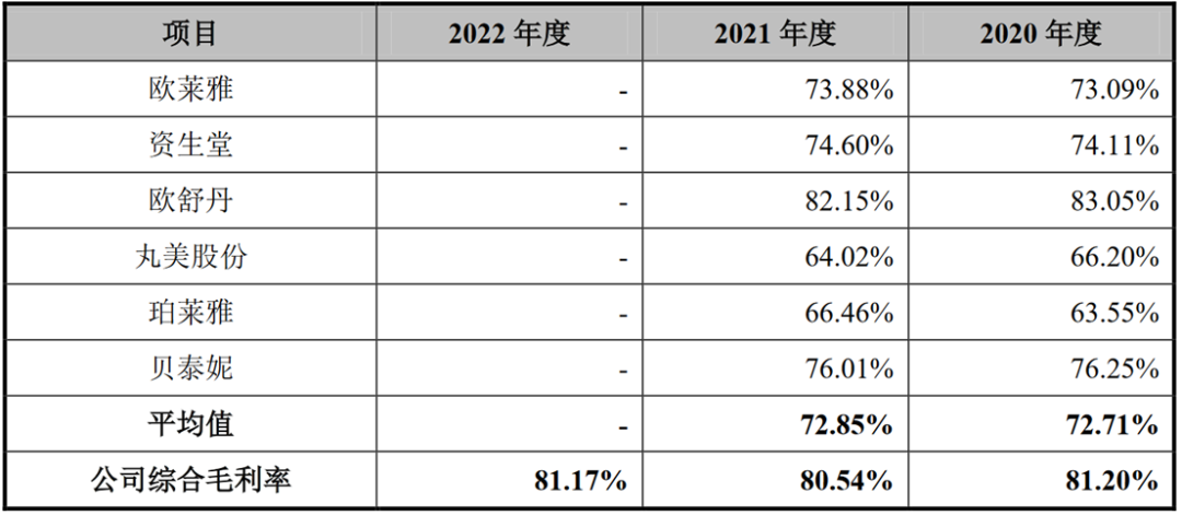 此外,從毛利率來看,因定位中高端的緣故,2020年至2022年,毛戈平品牌毛利率較高,分別為86.7%、84.45%、84.22%。公司整體毛利率在同行可比公司也名列前茅。