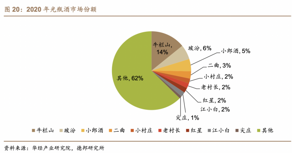 行業(yè)整體來(lái)看,由于光瓶酒行業(yè)壁壘不高,市場(chǎng)格局比較分散,幾乎各個(gè)地區(qū)都有地產(chǎn)性光瓶酒。德邦研究所數(shù)據(jù)顯示,2020年CR3僅為25%左右。