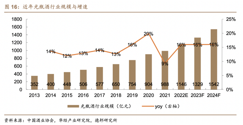 根據(jù)中國(guó)酒業(yè)協(xié)會(huì)市場(chǎng)調(diào)查報(bào)告顯示,光瓶酒行業(yè)自2013年駛?cè)肟燔嚨,市?chǎng)規(guī)模自352億元增長(zhǎng)至2021年的988億元,年均復(fù)合增速高達(dá)13.8%,預(yù)計(jì)2022年-2024年保持16%的年增長(zhǎng)速度,2024年市場(chǎng)規(guī)模將超過(guò)1500億元。