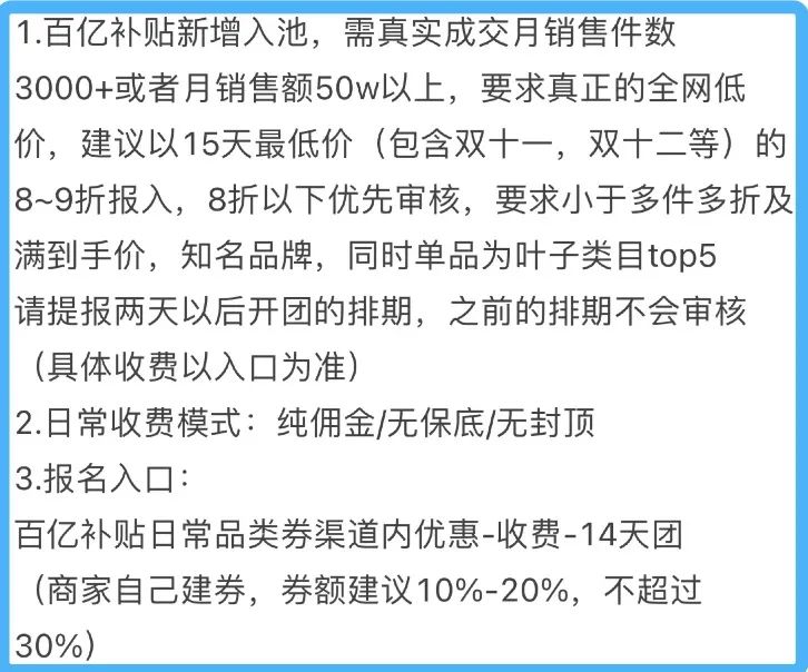 對比來看,聚劃算百億補貼給商家的準(zhǔn)入門檻就要高不少。一位天貓保健品行業(yè)人士向全天候科技透露,以為期14天的活動為例,平臺對其所在賽道百億補貼新增盤活的要求是真實成交月銷售件數(shù)3000+或者月銷售額50萬以上,收費采用純傭金模式,無保底、無封頂;不過,在定價機制上,聚劃算百億補貼采用的是商家自主報價方式,要求真正的全網(wǎng)低價,并建議以15天最低價的8-9折報入。