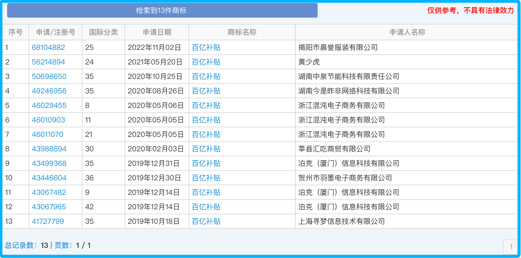 “百億補貼”商標(biāo)申請記錄(圖片來源:中國商標(biāo)網(wǎng))