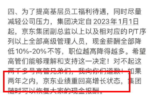 與此同時,劉強東已經(jīng)側(cè)面告訴我們一個信息,“如果兩年之內(nèi),京東業(yè)績重回高增長狀態(tài),集團隨時可以恢復大家的現(xiàn)金報酬!