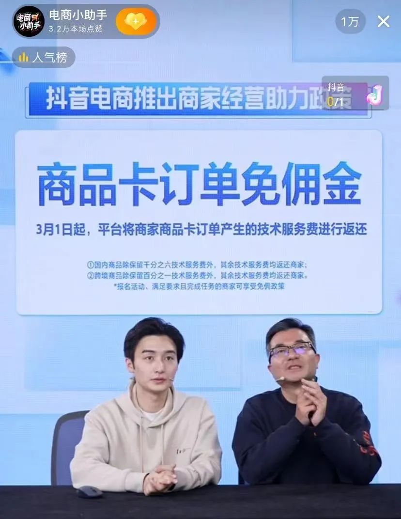 3月1日,抖音電商舉辦了一場(chǎng)商品卡政策發(fā)布會(huì)。會(huì)上,抖音電商副總裁木青宣布,平臺(tái)將對(duì)商家商品卡訂單產(chǎn)生的技術(shù)服務(wù)費(fèi)進(jìn)行返還,即商品卡訂單免傭金。