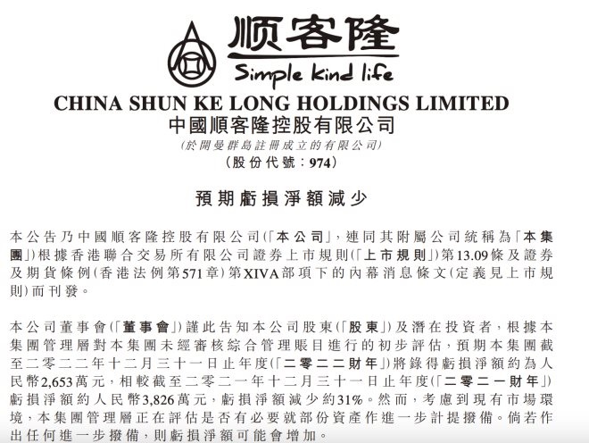 2月1日,中國順客隆發(fā)布業(yè)績預(yù)告。2022年度,中國順客隆預(yù)期將錄得虧損凈額約為2653萬元,相較2021年度的虧損凈額約3826萬元,虧損凈額減少約31%。