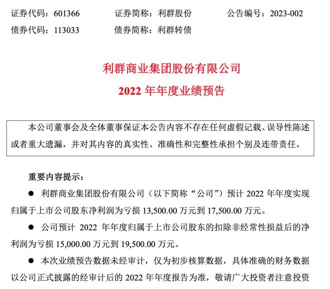 1月20日,利群股份發(fā)布2022年年度業(yè)績預(yù)告,預(yù)計2022年虧損1.35億元到1.75億元。