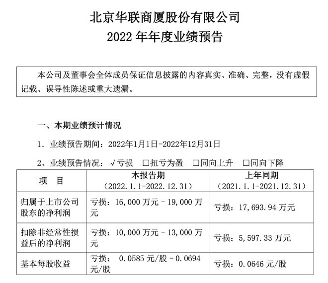 1月30日,北京華聯(lián)發(fā)布2022年年度業(yè)績預(yù)告,預(yù)計2022年度歸屬于上市公司股東凈利潤產(chǎn)生虧損。