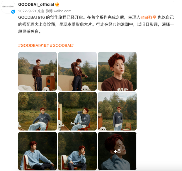 以白敬亭的GOODBAI為例,這家成立于2021年的品牌,由白敬亭創(chuàng)建,好友、也是國內(nèi)知名獨立設(shè)計師上官喆擔任創(chuàng)意及設(shè)計總監(jiān)。