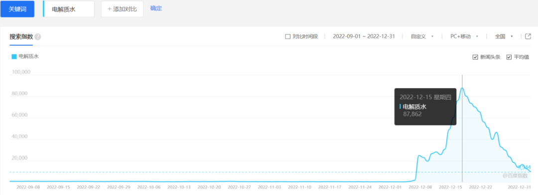 據(jù)百度指數(shù)顯示,去年12月份,“電解質(zhì)水”一詞搜索指數(shù)暴漲,當(dāng)月最高搜索指數(shù)接近4個月內(nèi)的平均值的10倍。這一現(xiàn)象不禁讓人想到了去年中旬“人參熬夜水”的爆火,靠著“整根人參”、“熬夜水”的設(shè)定,人參飲料成為了當(dāng)時的頂流。
