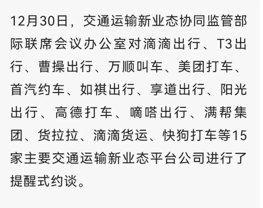 2022年 12 月底,有關(guān)部門(mén)就再次約談了行業(yè)內(nèi)的十五家出行平臺(tái),約談的內(nèi)容“當(dāng)前仍有部分平臺(tái)公司主體責(zé)任落實(shí)不到位”,存在隨意調(diào)整運(yùn)營(yíng)規(guī)則、侵害從業(yè)人員和乘客合法權(quán)益、潛藏安全穩(wěn)定風(fēng)險(xiǎn)隱患等問(wèn)題,影響交通運(yùn)輸新業(yè)態(tài)健康發(fā)展。