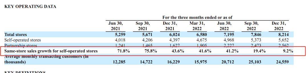 數(shù)據(jù)顯示,瑞幸同店銷(xiāo)售額的增幅連續(xù)8個(gè)季度下滑,最新的Q4季度同店增長(zhǎng)率為9.2%,首次跌至個(gè)位數(shù)。