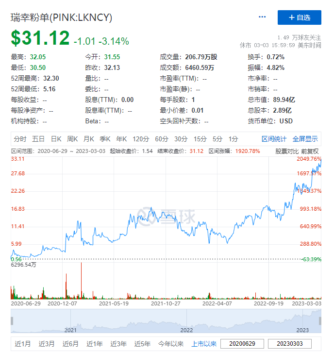 在最新財(cái)報(bào)公布后,瑞幸咖啡(PINK:LKNCY)最新股價(jià)報(bào)31.12美元每股。