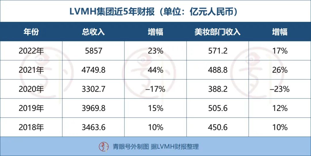 青眼號外梳理LVMH集團(tuán)近5年財(cái)報(bào)發(fā)現(xiàn),僅2020年業(yè)績有所下滑,去年該集團(tuán)整體收入為791.84億歐元(約合人民幣5857億元),同比增長23%,美妝部門取得77.22億歐元(約571.17億元),增長17%。其中,迪奧美妝、嬌蘭、紀(jì)梵希以及Fenty Beauty品牌都有不錯(cuò)的市場表現(xiàn)。