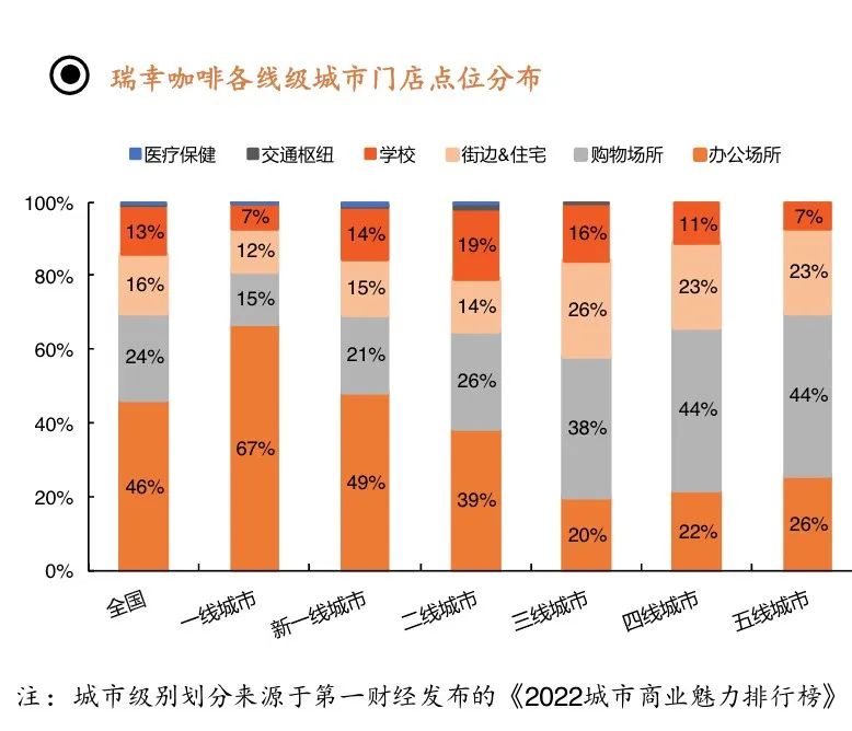 更細致些,一線城市中,辦公場所門店占比最高,達67%。隨著門店布局的不斷下沉,商場店及社區(qū)店的特征愈發(fā)明顯,四五線城市購物場所+街邊&住宅店占達67%。