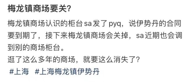 近日,據(jù)說是商場內部人員透露,上海南京西路的梅龍鎮(zhèn)廣場將在不久后關門,伊勢丹百貨合同會在明年到期,之后將正式退出上海,引發(fā)網友熱議。