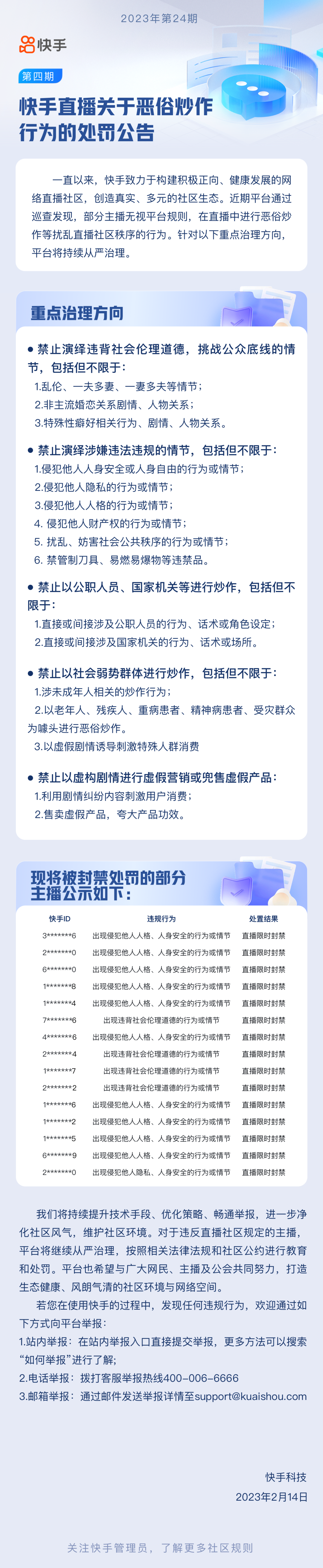 往近了說(shuō),今年2月14日快手發(fā)布了“惡俗炒作”處罰公告,明確禁止以虛構(gòu)劇情進(jìn)行虛假營(yíng)銷或兜售虛假產(chǎn)品?梢钥吹剑焓謱(duì)待這些投機(jī)取巧的主播并沒(méi)有手軟。