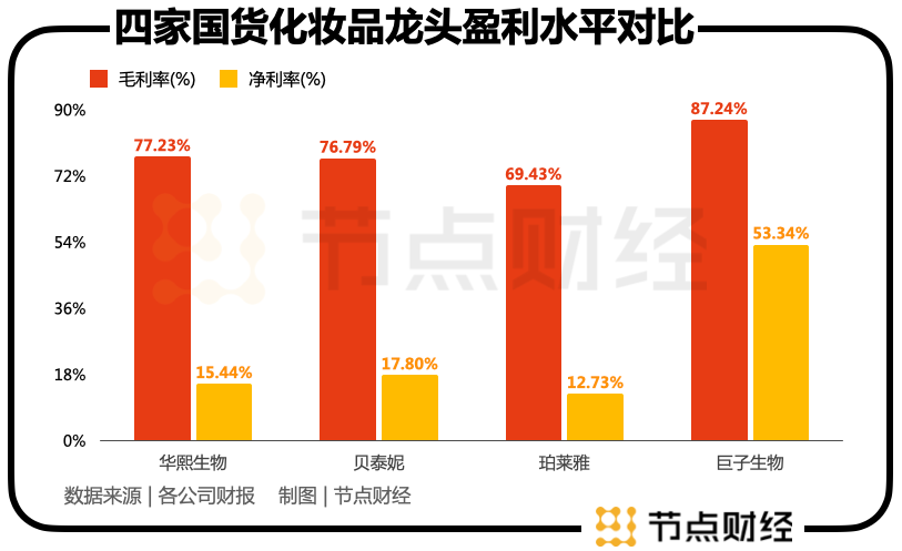 從四家龍頭公司的盈利水平看,巨子生物是最高的,2022年前三季度,公司毛利率高達(dá)87%,凈利率高達(dá)53%。