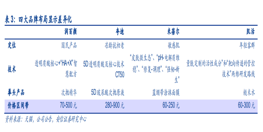 比如,公司第一大護(hù)膚單品“潤百顏”系列產(chǎn)品采用“透明質(zhì)酸核心+X”的智慧配方,產(chǎn)品對敏感肌、干皮、抗皺、美白等方面具有明確的功效。第二大單品夸迪采用“5D透明質(zhì)酸及核心技術(shù) CT50”主攻抗衰;第三大單品米蓓爾主攻敏感肌問題;第四大單品肌活瞄準(zhǔn)注重性價比的年輕消費群體。