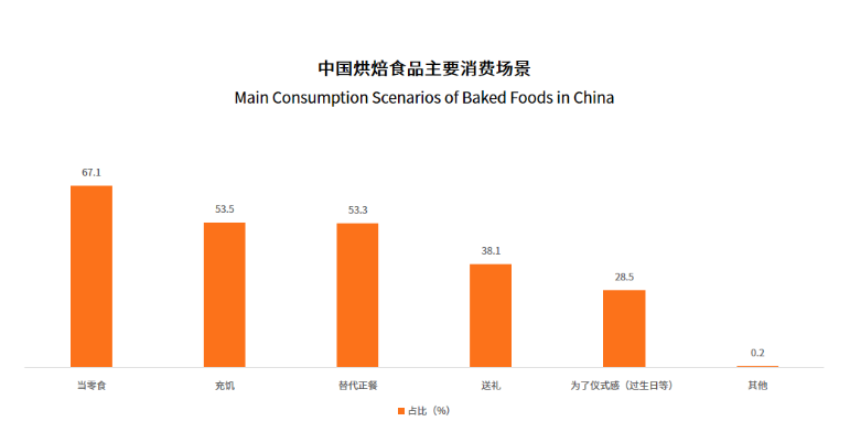我國(guó)正處于消費(fèi)升級(jí)階段,人均消費(fèi)水平呈上升趨勢(shì),我國(guó)烘焙食品行業(yè)人均消費(fèi)量有望持續(xù)上升,調(diào)研數(shù)據(jù)顯示,67.1%的消費(fèi)者將烘焙食品作為零食,充饑和替代正餐也是烘焙食品主要消費(fèi)場(chǎng)景,均達(dá)50%以上。