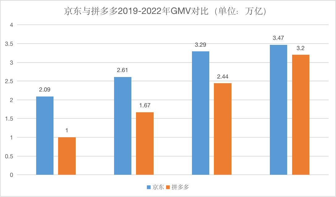 京東與拼多多2019-2022年GMV對比(單位:萬億)拼多多2022年GMV為推測