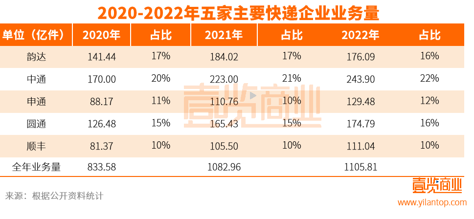此外,據(jù)韻達發(fā)布的2022年業(yè)績預(yù)告,2022全年業(yè)務(wù)量176.09億票,同比下降4.31%。凈利潤預(yù)計為13.08~15.03億元之間,同比下降11.44%~同比增長1.76%。