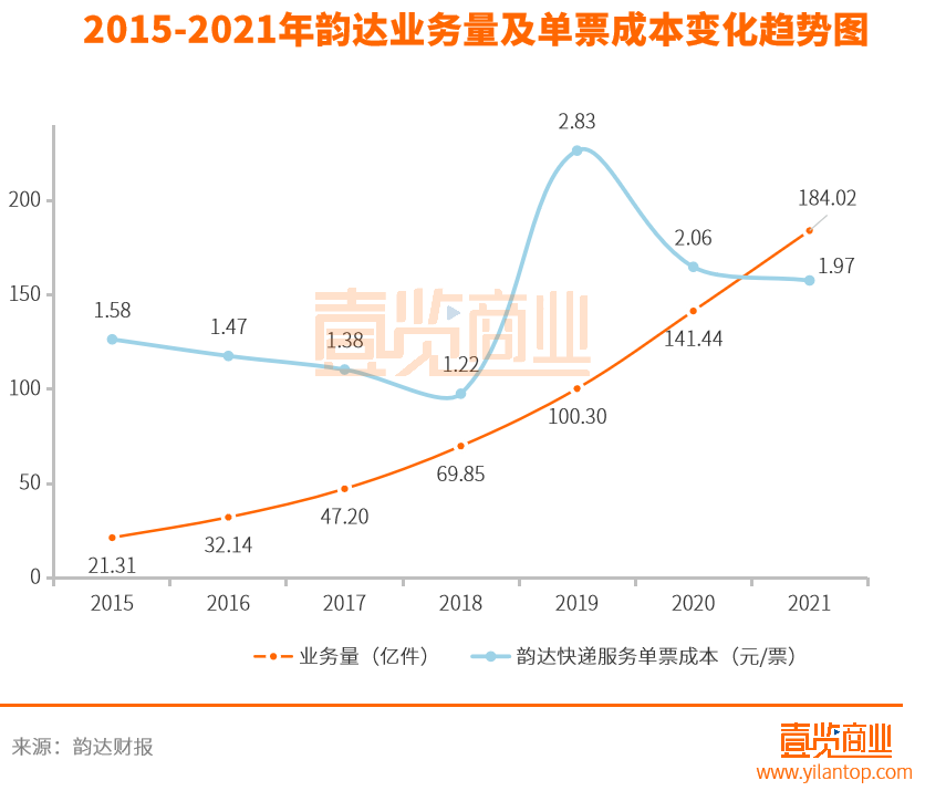 在多方作用下,快遞的成本確實在下降。比如,韻達 2021年,快遞服務(wù)單票成本是1.97元,而在2019年成本是2.83元。