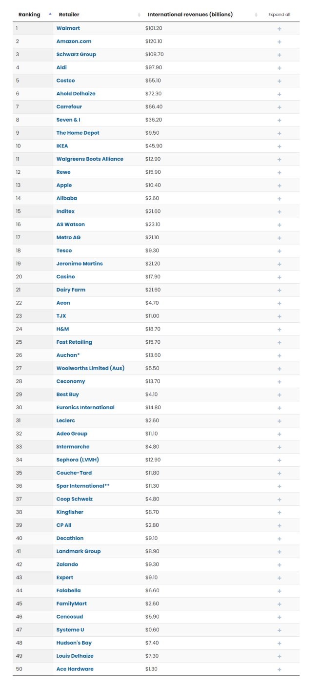美國NRF發(fā)布2023全球零售商50強榜單,沃爾瑪位列第一