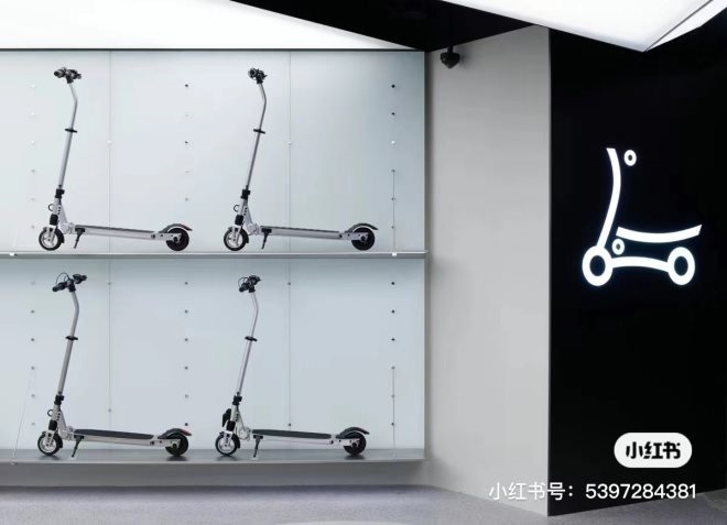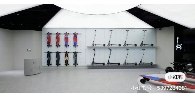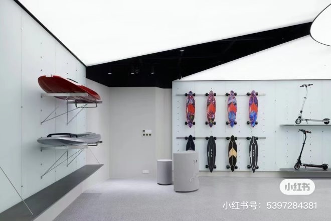 亞洲首店風(fēng)格簡潔清爽,整體以黑灰白色為主色調(diào),天花板被設(shè)計成圓弧碗狀,盡顯高級感和科技感。門店內(nèi)陳列著電動滑板、電動滑板車、飛盤、沖浪板等產(chǎn)品。