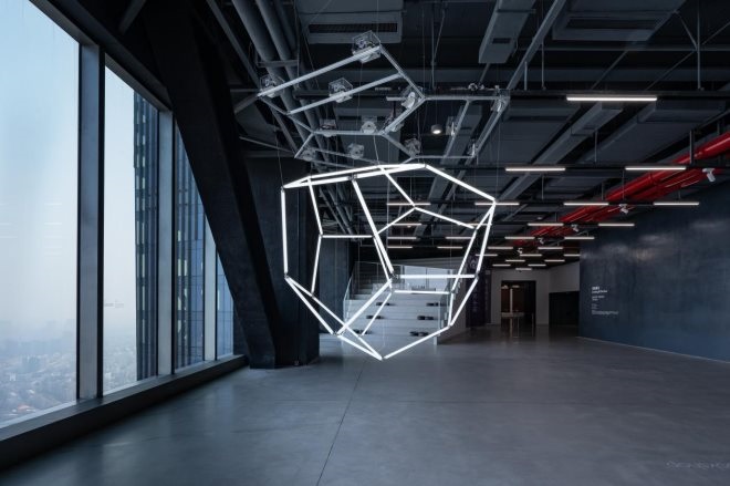 “‘星象魔法’的靈感源于劉慈欣短篇科幻小說《朝聞道》所涉及的,我們?nèi)祟愖怨乓詠韺τ谟钪娼K極問題的追求與探索”,策展人孫冬冬概括展覽主題的靈感來源時稱,小說中描述的“三十五萬年前人類祖先開始仰望星空的時刻”在他看來是從自然現(xiàn)象追問世界本質(zhì)的求知過程,也是一個從天文內(nèi)在于人文的文明過程,但難以獲得解答的終極疑問帶來的啟示則是“于我們而言,現(xiàn)實仍是一個魔法”。而當(dāng)觀眾身處于南京金鷹美術(shù)館52層高空中的物理空間位置,玻璃幕墻外的風(fēng)景直觀地提示著觀眾所處的時空維度,這樣的維度也和作品形成了有趣的互文。