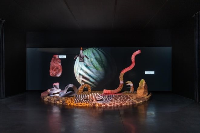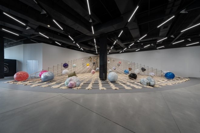 從某種意義上來說,劉月的《起源》,以物理學(xué)的形態(tài),重新將時間拉回到宇宙的尺度。而陳哲的特定場地裝置《夜空中的最后?程》,卷軸般的形式出發(fā),同樣是在超越人類生命時間的尺度中,去識別、連通生命的普遍經(jīng)驗。在沈心怡的《洋蔥大師》中,生命展現(xiàn)出一種徒勞的自我娛樂;與之對應(yīng)的,王梓全的委任創(chuàng)作《瞬息,呼吸的存儲器》,將亙古的生命欲望轉(zhuǎn)化為一種想象未來的技術(shù)動力,通過環(huán)繞大廳的軌道,串聯(lián)起“星象魔法”的時空之旅。