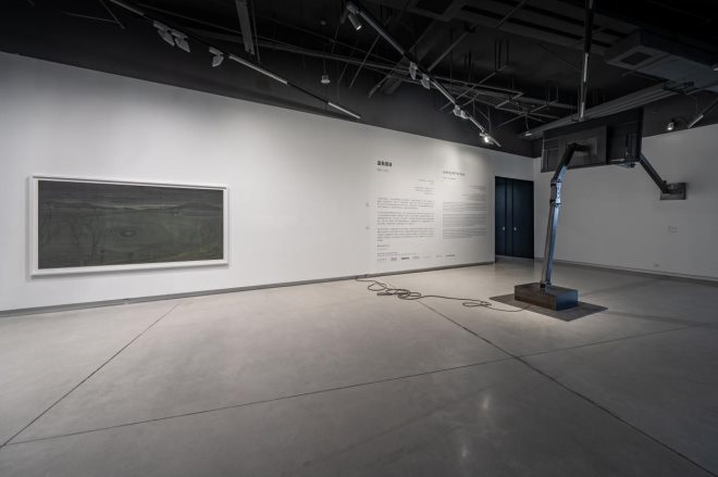 展覽的敘事起始于序廳王郁洋的作品《柏拉圖的立方體》,在永恒與運動的思辨中,打開一個多維度、多視角的復(fù)雜對話。進(jìn)入主展廳,徐渠為展覽委托定制的大型裝置《觸碰》,通過一對機(jī)械臂上的現(xiàn)代行星影像,隱喻了上帝創(chuàng)造亞當(dāng)?shù)臅r刻,將人類對于宇宙的好奇引向一種知性深處,同時在他的繪畫《塵!分,又在從太空對地球的回望中,將向外的目光反射回觀察的主體。