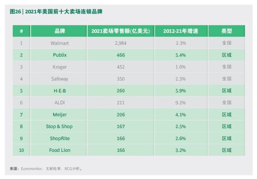直至今日,全美前十大賣場連鎖品牌中區(qū)域零售商占據(jù)六席。區(qū)域零售商通常專注服務(wù)6-8個(gè)州(相當(dāng)于國內(nèi)2-3個(gè)。ㄟ^多業(yè)態(tài)運(yùn)營可實(shí)現(xiàn)千億元人民幣的銷售規(guī)模,與全國性零售商抗衡。區(qū)域零售商已建立護(hù)城河,在過去十年的銷售增速往往高于全國性零售商,競爭優(yōu)勢持續(xù)擴(kuò)大。