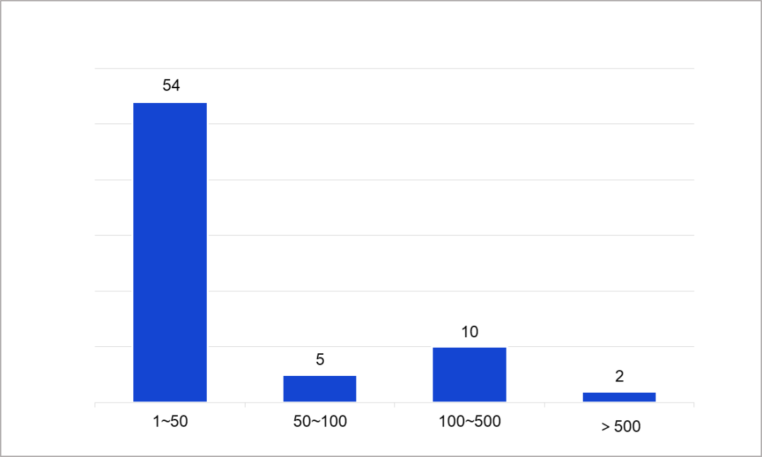 有54家企業(yè)門店數(shù)量在1~50家區(qū)間,5家企業(yè)在50~100區(qū)間,10家企業(yè)在100~500區(qū)間,2家企業(yè)門店數(shù)在500家以上。