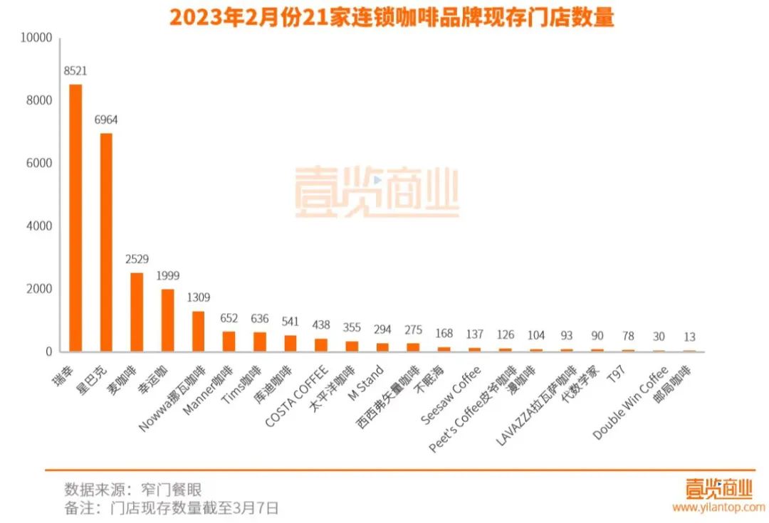 據(jù)壹覽商業(yè)統(tǒng)計(jì)數(shù)據(jù)顯示,截至3月7日,21家連鎖咖啡品牌現(xiàn)存門(mén)店數(shù)量達(dá)25352家,其中瑞幸現(xiàn)存門(mén)店8521家。