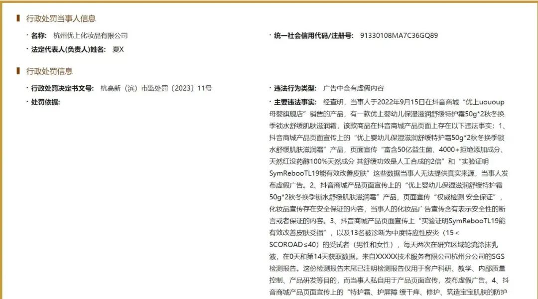 行政處罰決定書顯示,杭州優(yōu)上公司于2022年9月15日在抖音商城“優(yōu)上uououp母嬰旗艦店”銷售的優(yōu)上嬰幼兒保濕滋潤舒緩特護(hù)霜(即“優(yōu)上嬰童保濕舒緩護(hù)理霜”),在抖音商城產(chǎn)品頁面宣傳“富含50億益生菌、4000+拒絕添加成分、天然紅沒藥醇 100%天然成分 其舒緩功效是人工合成的2倍”和“實驗證明SymRebooTL19能有效改善皮膚”等數(shù)據(jù),杭州優(yōu)上公司無法提供真實來源,因此被杭州市高新技術(shù)產(chǎn)業(yè)開發(fā)區(qū)(濱江)市場監(jiān)督管理局認(rèn)定為發(fā)布虛假廣告。