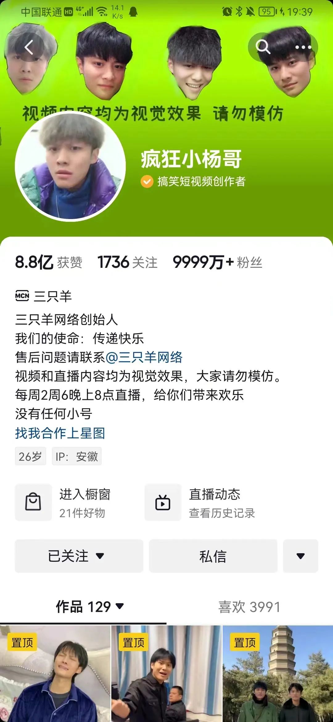公開信息顯示,小楊哥本名張慶楊,2015年,他注冊名為“瘋狂小楊哥”的賬號,正式成為一個短視頻創(chuàng)作者。3年后,他入駐抖音,注冊了同名賬號,同步發(fā)布視頻內(nèi)容。 他走紅的第一個節(jié)點,正是一個“自我捉弄式”的整蠱視頻,自此便一發(fā)不可收。