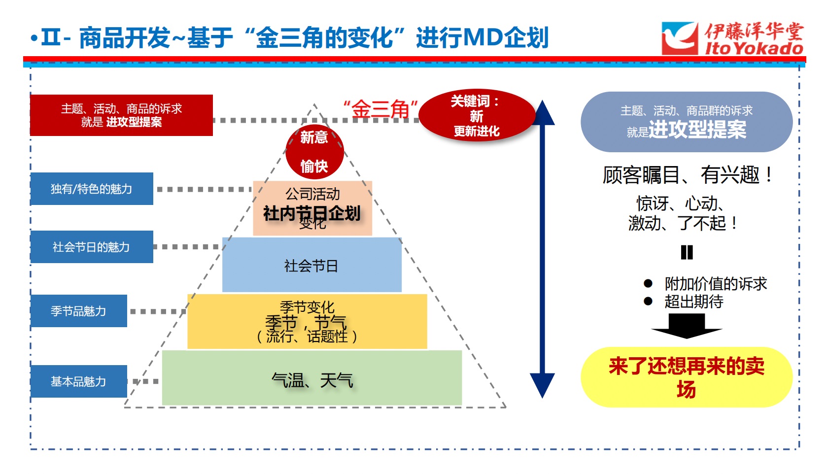 “在這個(gè)金三角中,金字塔的底部的‘氣溫天氣’是最優(yōu)先考慮的文化;其次是季節(jié)和流行話題的內(nèi)容,第三是要考慮社會節(jié)日,這對于顧客的吸引力是最大的;另外我們要造勢造節(jié),有自己的社內(nèi)節(jié)日企劃!卑凑者@些元素組成的“金三角”組成了全年MD企劃的“指南”。