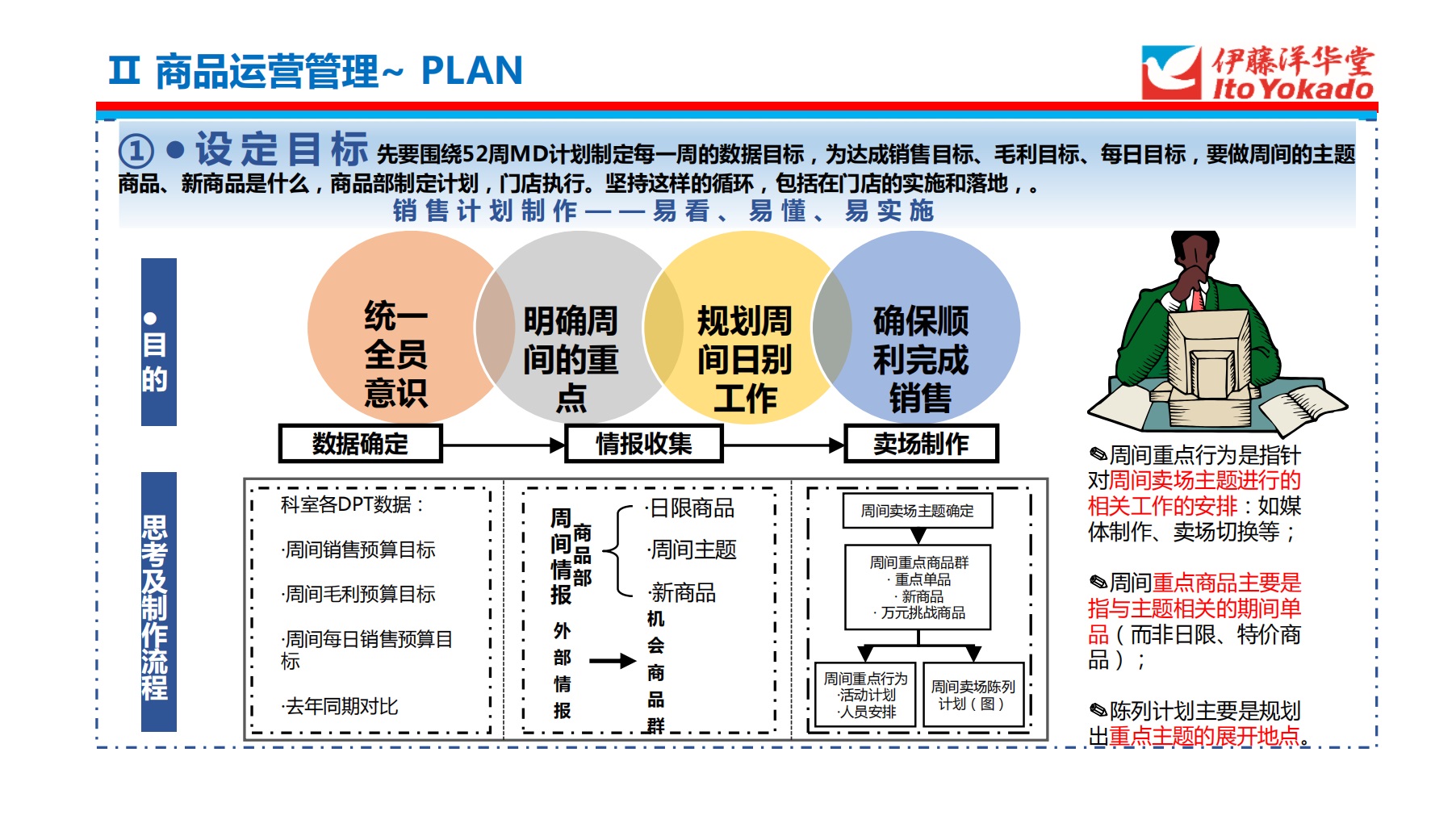 “選擇好了重點(diǎn)商品,就要舉公司全力來做好52周MD運(yùn)營體制!蓖跗G表示,在伊藤洋華堂,這需要營銷企劃、采購部、銷售部以及物流部,四方一起來聯(lián)動MD計(jì)劃實(shí)施落地。