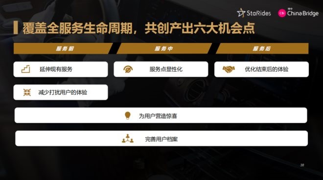 針對不同用戶,在使用出行服務(wù)時會有哪些關(guān)鍵旅程?在這旅程當(dāng)中又有哪些機(jī)會點(diǎn)?旅程服務(wù)會有前中后的可能性,會共創(chuàng)出六大機(jī)會點(diǎn),第一是延伸現(xiàn)有服務(wù),第二是服務(wù)點(diǎn)顯性化,第三是優(yōu)化結(jié)束后的體驗(yàn),第四是減少打擾用戶的體驗(yàn),第五是為用戶創(chuàng)造驚喜,第六是完善用戶檔案。