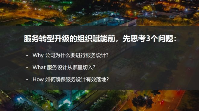 至于服務(wù)轉(zhuǎn)型升級的組織賦能,在這之前先想三個問題,第一個是why?為什么公司要進(jìn)行服務(wù)設(shè)計(jì),第二個what?服務(wù)設(shè)計(jì)從哪里切入,第三個是how?如何保證服務(wù)有效的落地,這三個問題想清楚了再做。