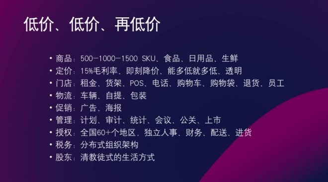 那么究竟如何將商品價(jià)格降低?龐總以ALDI作為例子給大家進(jìn)行了講述,首先對(duì)SKU極其克制,第二個(gè)就是即刻降價(jià),一旦進(jìn)貨價(jià)格降低,就立馬降低商品價(jià)格,做到完全透明。第三是放棄位置,選擇租金低的地方開店。第四是放棄貨架,貨架需要錢,所以直接選擇將貨堆到地板上。